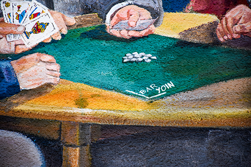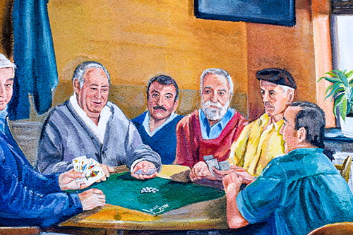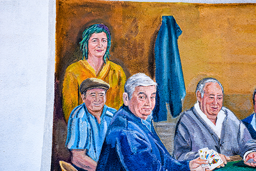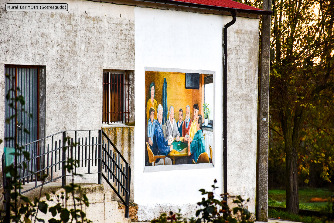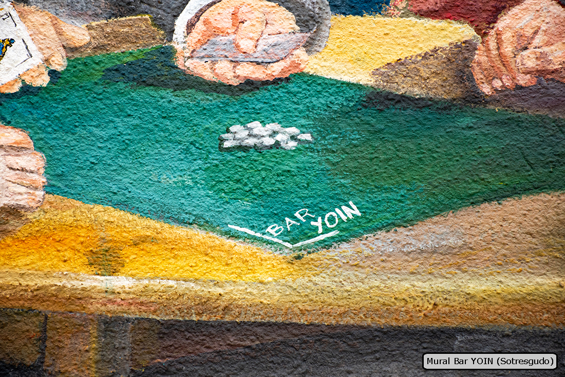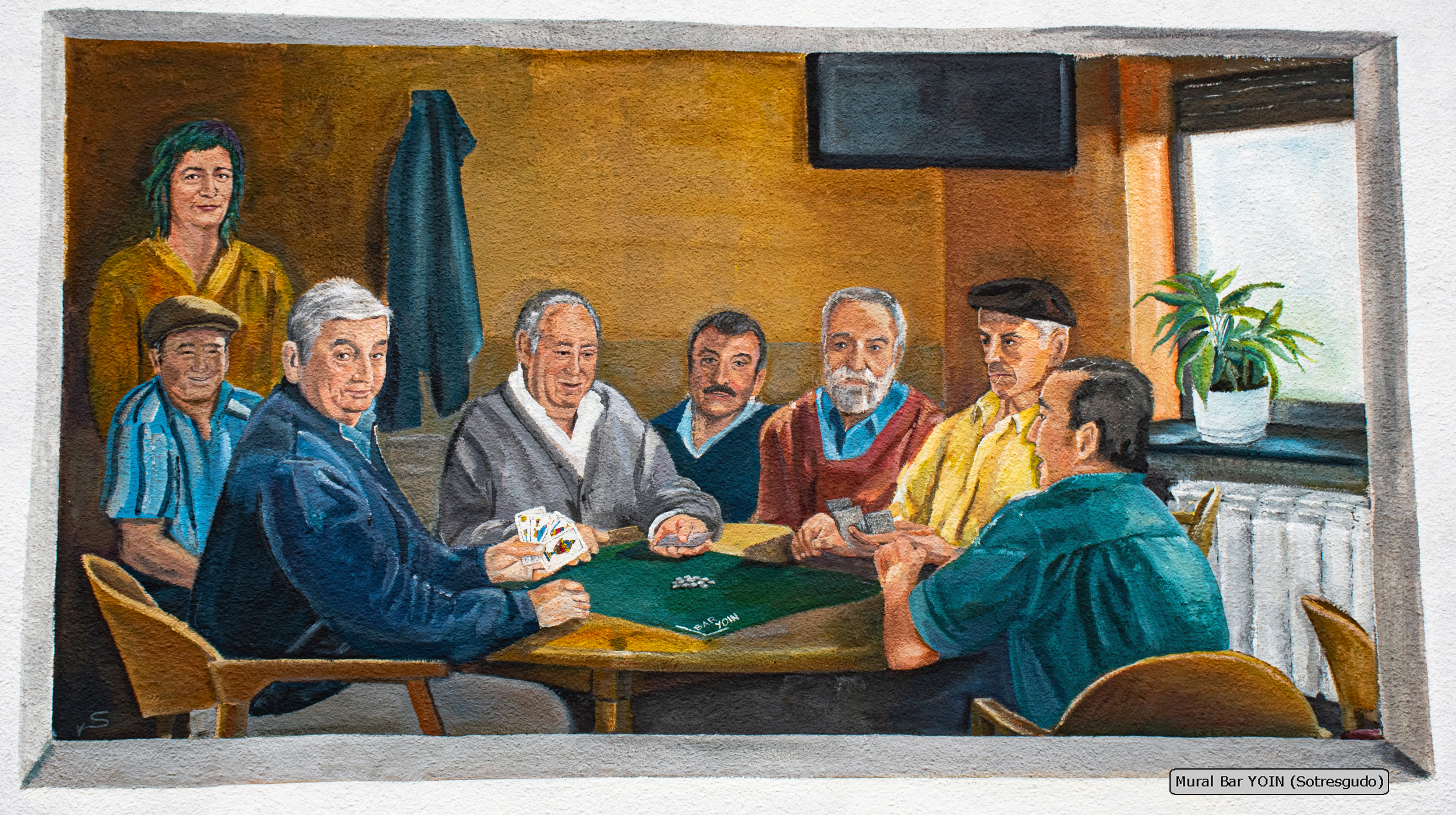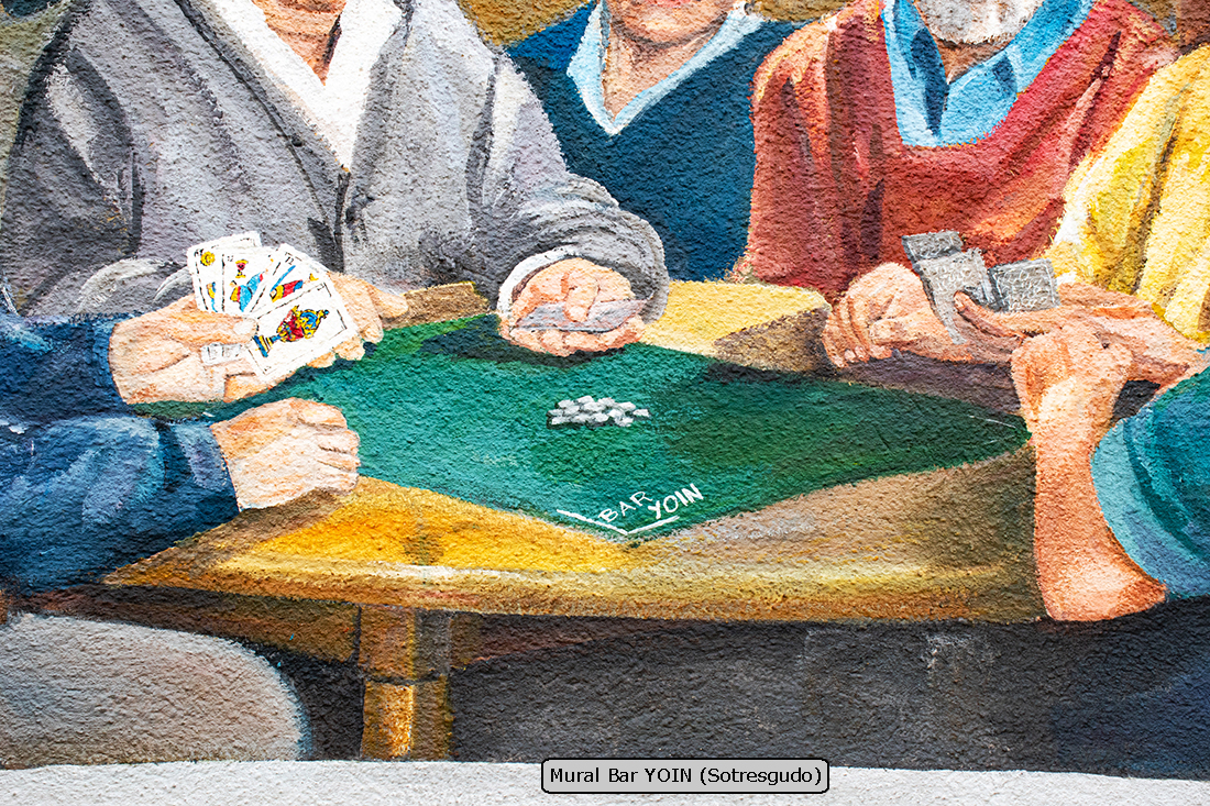 El bar YOIN es un lugar tradicional en el que se juntan muchas personas por las tardes a jugar a las cartas, especialmente al mus, por lo que el mural representa un aspecto habitual del local.