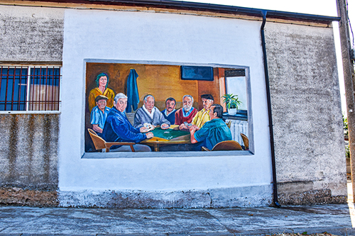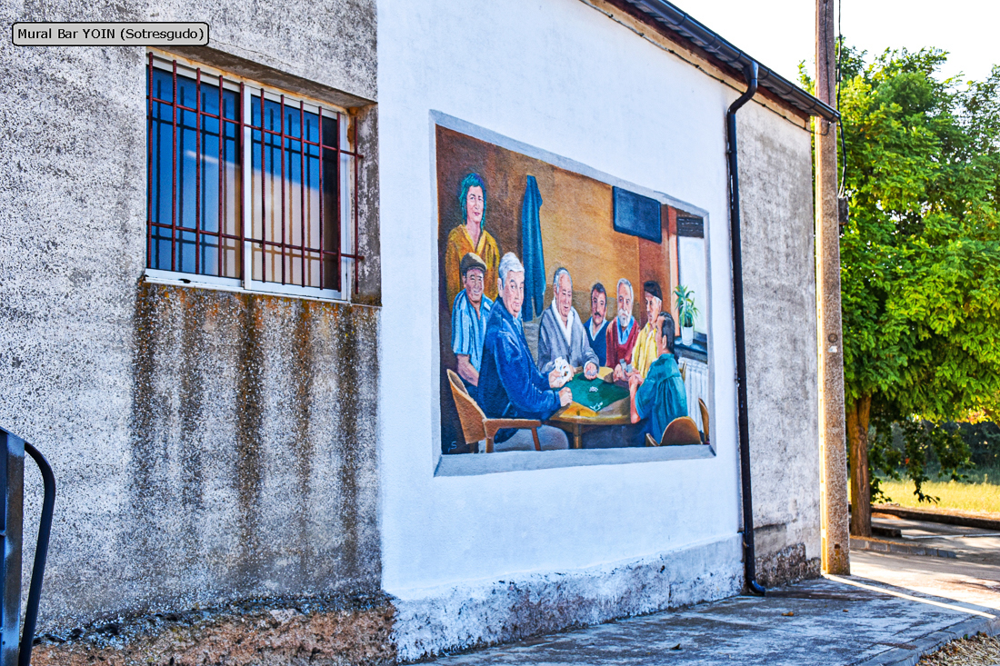 Representa una partida de cartas en el bar YOIN y está en el exterior de un almacén que hay enfrente del bar, junto a la carretera que lleva a Villanueva de Odra.