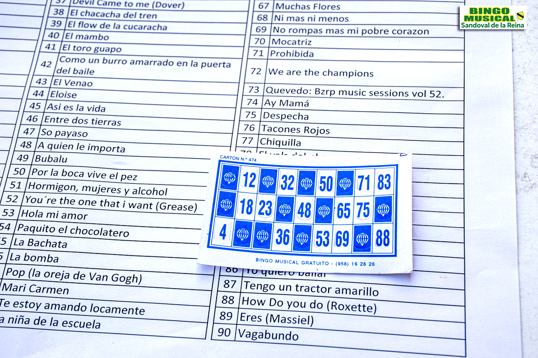 Se venden cartones de bingo cuyo dinero va para los premios y una parte para los fondos de la asociación. Cada canción se corresponde con un número del cartón de bingo. Junto con los cartones, se da a los jugadores una lista numerada de las canciones que van a sonar. Cada vez que suena una canción, solo durante unos segundos, si identificamos cuál es, se marca en el cartón el número que corresponda de la lista. El primero que haya marcado todos los números de su cartón canta el bingo y se lleva el premio. Las canciones suenan al azar.