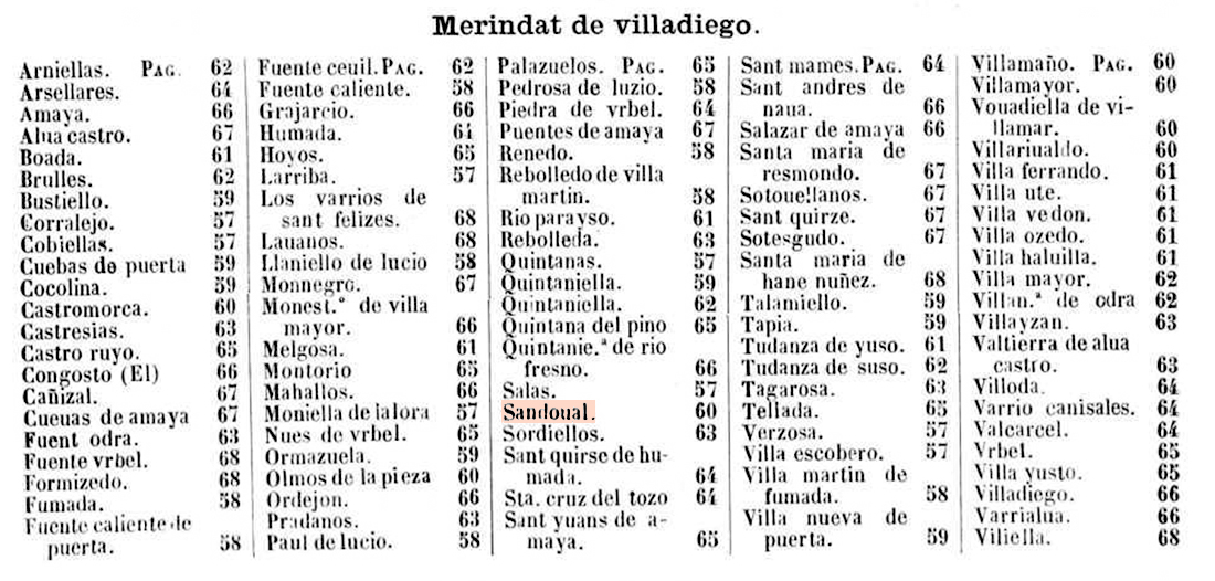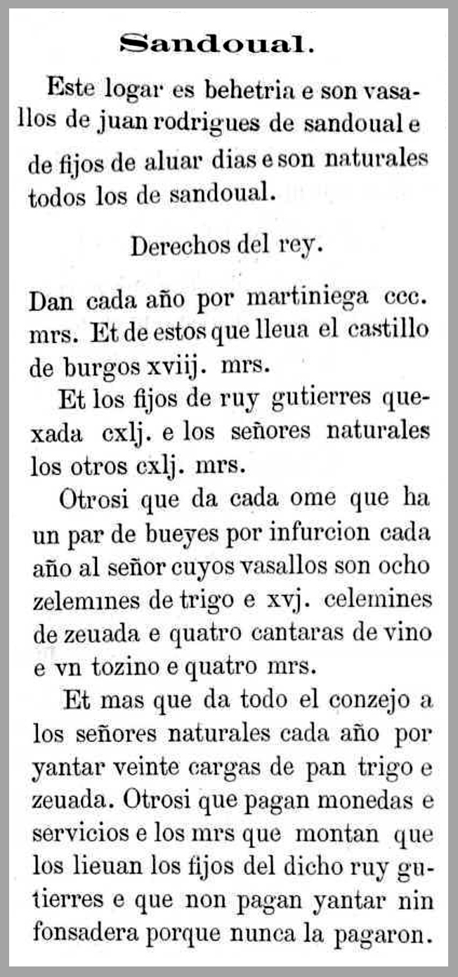 Se recogen aquí sucesivamente: SandoualEste logar es behetria e son vasallos de juan rodrigues de sandoual e de fijos de aluar dias e son naturales todos de sandoual Derechos del rey Dan cada año por martiniega ccc. mrs. Et de estos que lleua el castillo de burgos xviij. mrs. Et los fijos de ruy gutierres quexada cxlj. e los señores naturales otros cxlj. mrs. Otrosi que da cada ome que ha un par de bueyes por infurcion cada año al señor cuyos vasallos son ocho zelemmes de trigo e xvj. celemines de ceuada e quatro cantaras de vino e vn tozino en quatro mrs. Et mas que da todo el conzejo a los señores naturales cada año por yantar veinte cargas de pan trigo e zeuada. Otrosi que pagan monedas e servicios e los mrs. que montan que los lieuan los fijos de dicho ruy gutierres e que non pagan yantar nin fonsadera porque nunca la pagaron. SandovalEste lugar es behetría y son vasallos de Juan Rodríguez de Sandoval y de los hijos de Álvar Díaz, y todos son naturales de Sandoval. Derechos del rey Dan cada año por martiniega 300 maravedíes. Y de estos recibe el castillo de Burgos 18 maravedíes. Y los hijos de Ruy Gutiérrez de Quijada reciben 141, y los señores naturales otros 141 maravedíes. Así mismo, cada hombre que tiene un par de bueyes da por infurción cada año al señor de quien es vasallo ocho celemines de trigo, y 16 celemines de cebada y cuatro cántaras de vino y un tocino valorado en cuatro maravedíes. Y además, todo el concejo da a los señores naturales cada año por yantar veinte cargas de pan, trigo y cebada. Así mismo, pagan monedas y servicios, y los maravedíes que suman los reciben los hijos del dicho Ruy Gutiérrez, y no pagan yantar ni fonsadera porque nunca la pagaron. SandovalImagina el pueblo de Sandoval en el siglo XIV. No es un lugar cualquiera: es una behetría, lo que significa que sus vecinos no están atados para siempre a un único señor, sino que, al menos en teoría, pueden elegir a quién servir. Aún así, en este momento concreto dependen de dos linajes: por un lado, Juan Rodríguez Sandoval, y por otro, los descendientes de Álvar Díaz. Todos los habitantes, además, son del propio pueblo, no hay forasteros dominando la comunidad. Cada año, como en casi todos los lugares de la época, tienen que pagar impuestos al rey. En total son 300 maravedíes, una cantidad importante. De ese dinero, una pequeña parte, 18 maravedíes, va destinada al mantenimiento del castillo de Burgos. El resto se reparte entre los señores que tienen derechos sobre el lugar: los hijos de Ruy Gutiérrez de Quijada y los llamados «señores naturales» que reciben cantidades iguales. Pero la carga no se queda sólo en el dinero. La vida en Sandoval está muy ligada al campo, así que muchos pagos se hacen en productos. Así, cualquier vecino que tenga una yunta de bueyes, es decir, quien dispone de medios para trabajar la tierra, debe entregar cada año una especie de renta al señor: trigo cebada, vino y un tocino. Además, todo el pueblo en conjunto tiene otra obligación: proporcionar alimento a sus señores. Cada año entregan ciertas cantidades de cereal, lo suficiente para alimentarles durante un tiempo. Es lo que se llama «yantar», una especie de manutención obligatoria. También existen otros impuestos más generales conocidos como «monedas y servicios», que vuelven a parar a manos de los mismos señores. Sin embargo, no todo son obligaciones, ya que los vecinos de Sandoval conservan un pequeño privilegio: no tienen que pagar ciertos tributos como la fonsadera (relacionada con la guerra) ni, en algunos casos, el propio yantar, porque, según la tradición, nunca han estado obligados a ello y, en una época en la que casi todo se debía conservar, una exención así marcaba una diferencia significativa. En conjunto, la vida en Sandoval era la de una comunidad campesina que trabajaba la tierra, repartía parte de lo que producía entre el rey y sus señores y, al mismo tiempo, mantenía algunas libertades heredadas de su condición de behetría.
